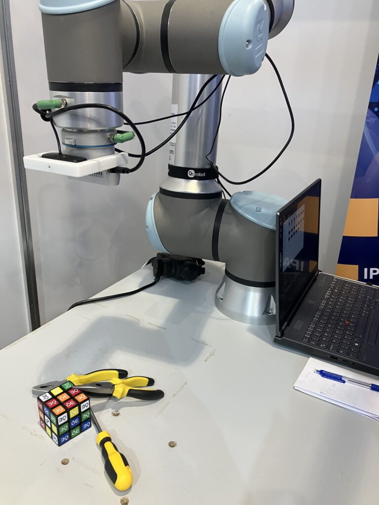 A Bejczy Antal iRobottechnikai Központ (BARK) részéről egy Universal Robots UR16e típusú ipari robotkar került bemutatásra, amely egyedi fejlesztésű 3D digitalizáló rendszerrel működött együtt. A rendszer valós környezeteket képes rekonstruálni úgy, hogy a robotkar több nézőpontból lefényképezi az ismert geometriájú objektumokat, majd a képeken jellemző pontokat azonosítva és optimalizációs eljárásokkal feldolgozva építi fel a környezet térbeli modelljét. Az így létrejövő, valósághű 3D-s Blender-modell kiválóan alkalmas tanítóadatok előállítására neurális hálók számára, lehetővé téve, hogy a valós képeket szintetikus adatokkal bővítve akár végtelen méretű, annotált adatbázisok készüljenek – ez pedig kulcsfontosságú a mesterséges intelligencia-alapú látásrendszerek fejlesztésében.